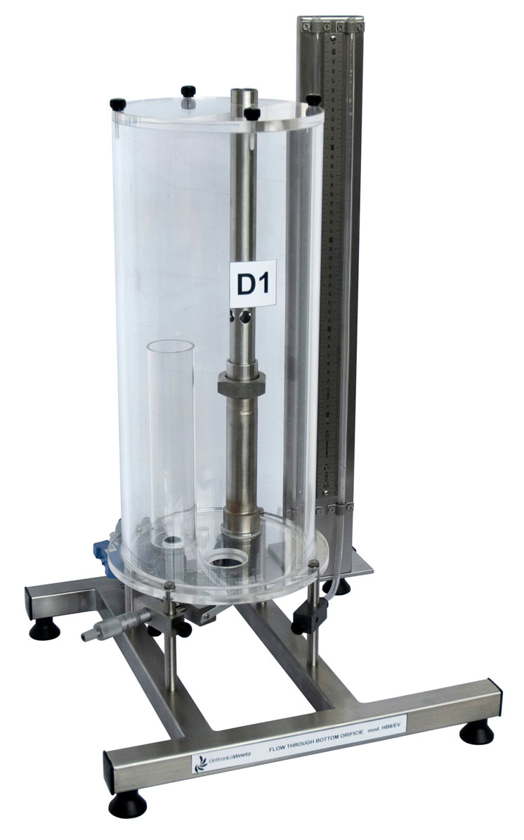 Il modulo è costituito da un serbatoio cilindrico con un orifizio alla base che consente di studiarne il flusso in uscita. L’acqua, proveniente dal banco idraulico, entra attraverso un sistema che elimina le turbolenze mentre un troppopieno consente di mantenere il livello costante. Sotto il serbatoio un dispositivo permette di posizionare un tubo di Pitot sotto il getto in varie posizioni. Una lama sottile graduata accoppiata al tubo di Pitot viene posta sotto il getto per misurare il diametro all’uscita e il diametro della vena contratta ricavando quindi il coefficiente di contrazione. La pressione statica e quella totale attraverso l’orifizio sono lette su tubi manometrici a lato del serbatoio. In dotazione vengono forniti 5 diversi orifizi.