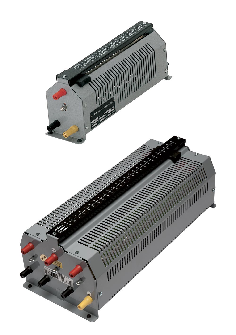 Resistenze variabili in versione da laboratorio, avvolti su cilindri tubolari di porcellana. Lega resistiva in costantana, ancorata alle estremità a collari, cursore con contatti rame-argento, riportati su morsetti di sicurezza Ø 4 mm.